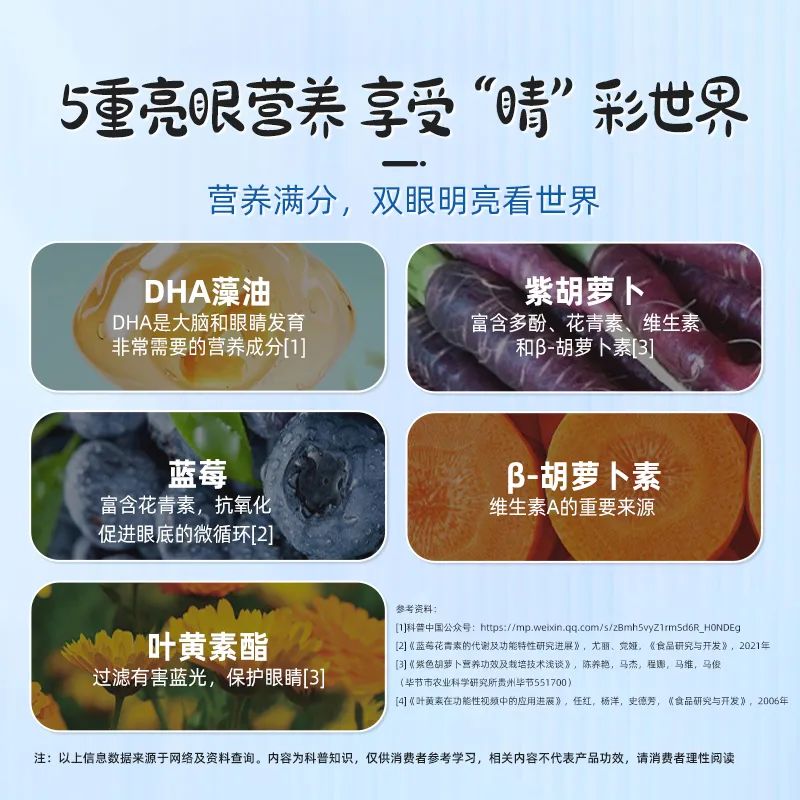DHA,是大腦和眼睛發(fā)育非常需要的營養(yǎng)成分[1],為孩子的視力和智力發(fā)展提供能量;藍(lán)莓,這個自然界的抗氧化小能手,富含的花青素能促進(jìn)眼底的微循環(huán)[2],讓孩子的眼睛更加明亮;紫胡蘿卜,藏著多酚、花青素、維生素和β-胡蘿卜素[3],為孩子的眼睛健康筑起一道堅(jiān)實(shí)的防線;β-胡蘿卜素,作為維生素A的重要來源,默默守護(hù)著孩子的視網(wǎng)膜健康;而葉黃素酯,則是過濾有害藍(lán)光的勇士[3],保護(hù)孩子的眼睛。