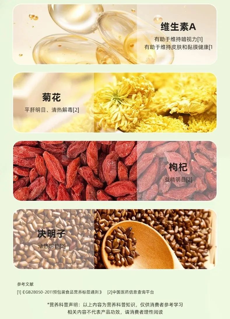三大愛(ài)眼草本,菊花平肝明目、清熱解毒[7],枸杞益精明目[7],決明子清熱明目[7];加上維生素A有助于維持暗視力[6],呵護(hù)雙眼,孩子視界更“睛”彩。