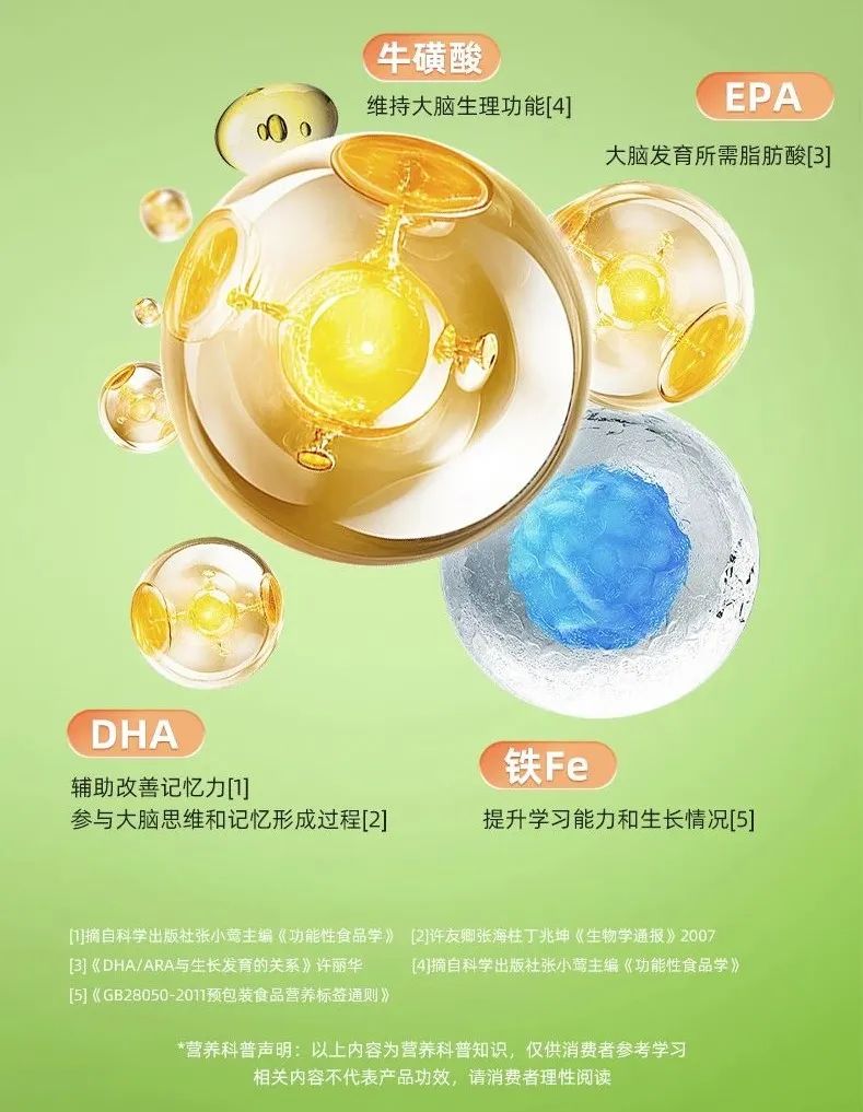 很多人不知道,DHA、EPA和?;撬崾谴竽X發(fā)育的“黃金三角”,例如EPA大腦發(fā)育所需脂肪酸[3]。它們不僅參與大腦的思維和記憶形成過(guò)程[2],輔助改善記憶力[1],還能維持大腦的生理功能[4]。